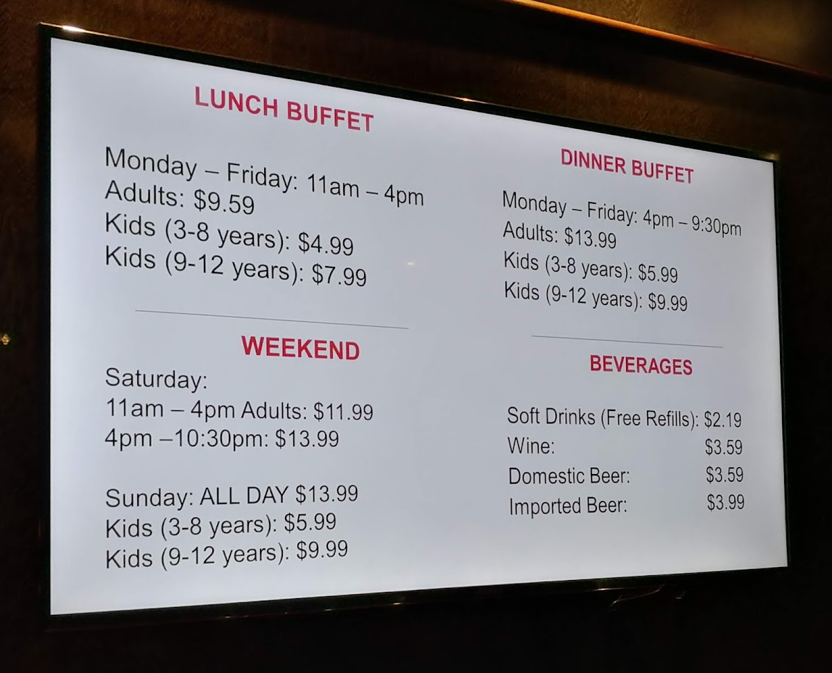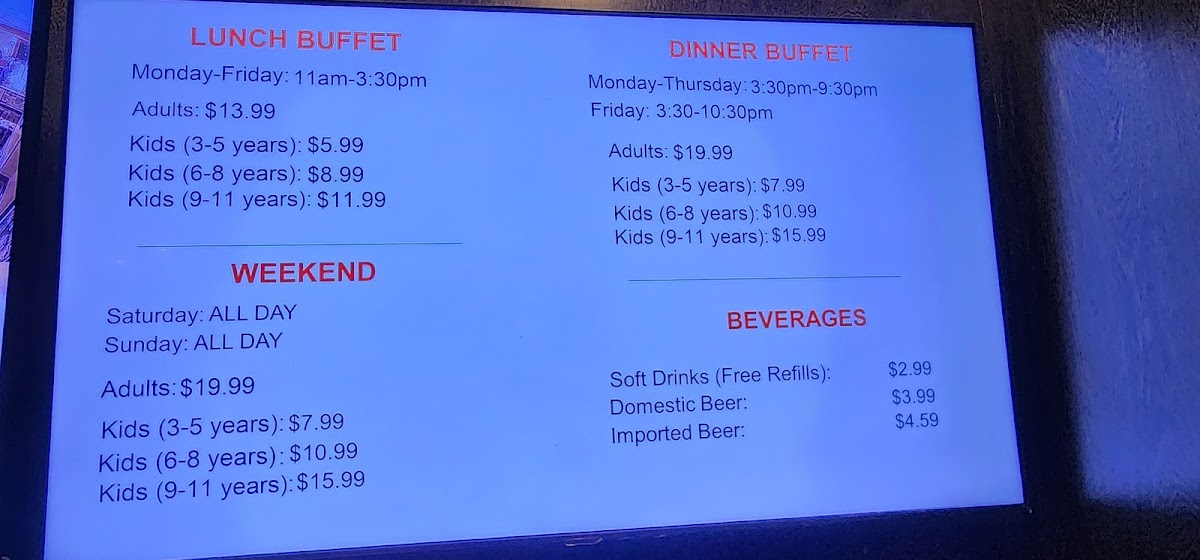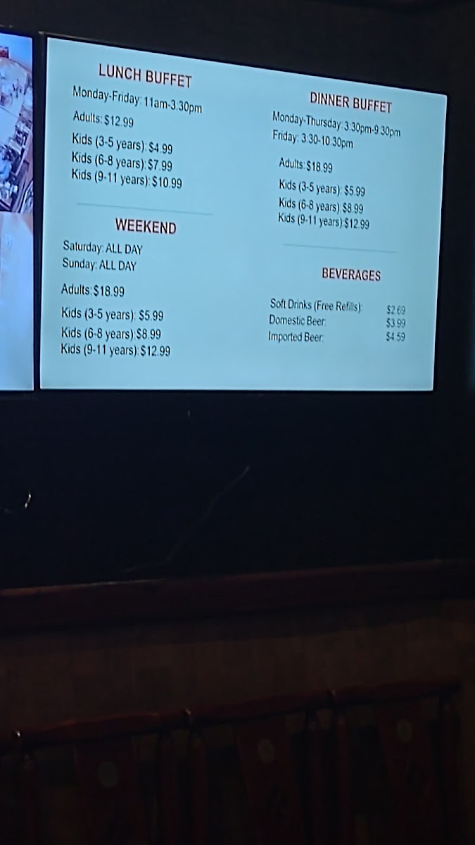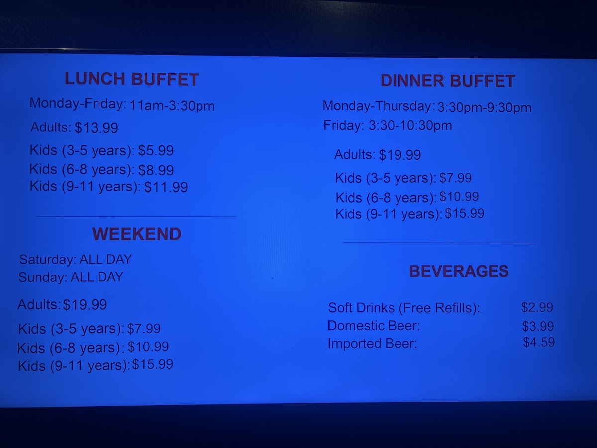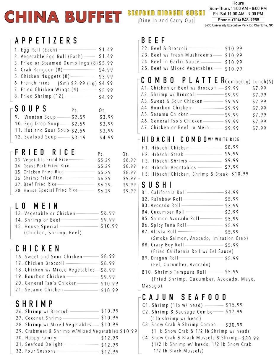 The menu at China Buffet offers a wide range of Chinese and buffet-style dishes, suitable for casual dining and group meals. Guests can expect numerous options spanning appetizers, soups, main courses, and beverages, all arranged to allow for easy selection in a buffet setting.