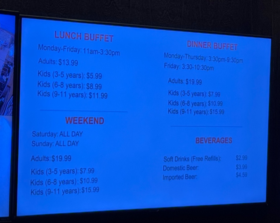 - Buffet Entrées and Specials: A diverse selection that typically includes dishes such as spicy pork, fried shrimp, salt and pepper shrimp, BBQ spare ribs, salt and pepper frog legs, hibachi steak with vegetables and lo mein, as well as seafood options like tilapia and mussels.