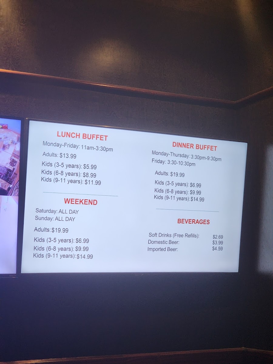 This menu provides a variety of choices suitable for lunch or dinner, accommodating those looking for either quick service via the buffet or a more interactive experience at the hibachi grill. The assortment allows visitors to customize their meal according to their preferences with multiple protein, vegetable, and starch options alongside traditional Chinese flavors.